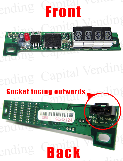 There are two similar versions of this display. The both have four LED displays with fourteen segments. One has the connector on the rear, the second style has the connector mounted on the parts side. Each style of display is shown in this area of the website.