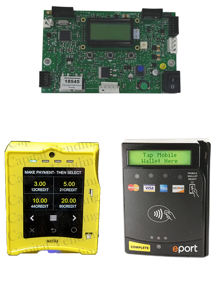 The kits will connect to either a Nayax Touch or a Cantaloupe G11 using pulse interface. Cash sales are not recorded with this kit. Only sales by the card reader.