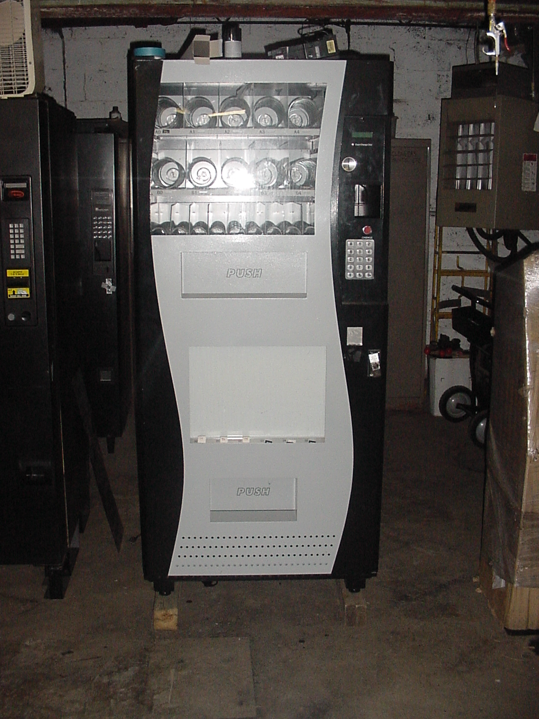 Genesis GO-380 Combination Snack/Drink Machine with dollar bill validator and coin changer. The machine does not accept credit cards. Comes with lock and keys.